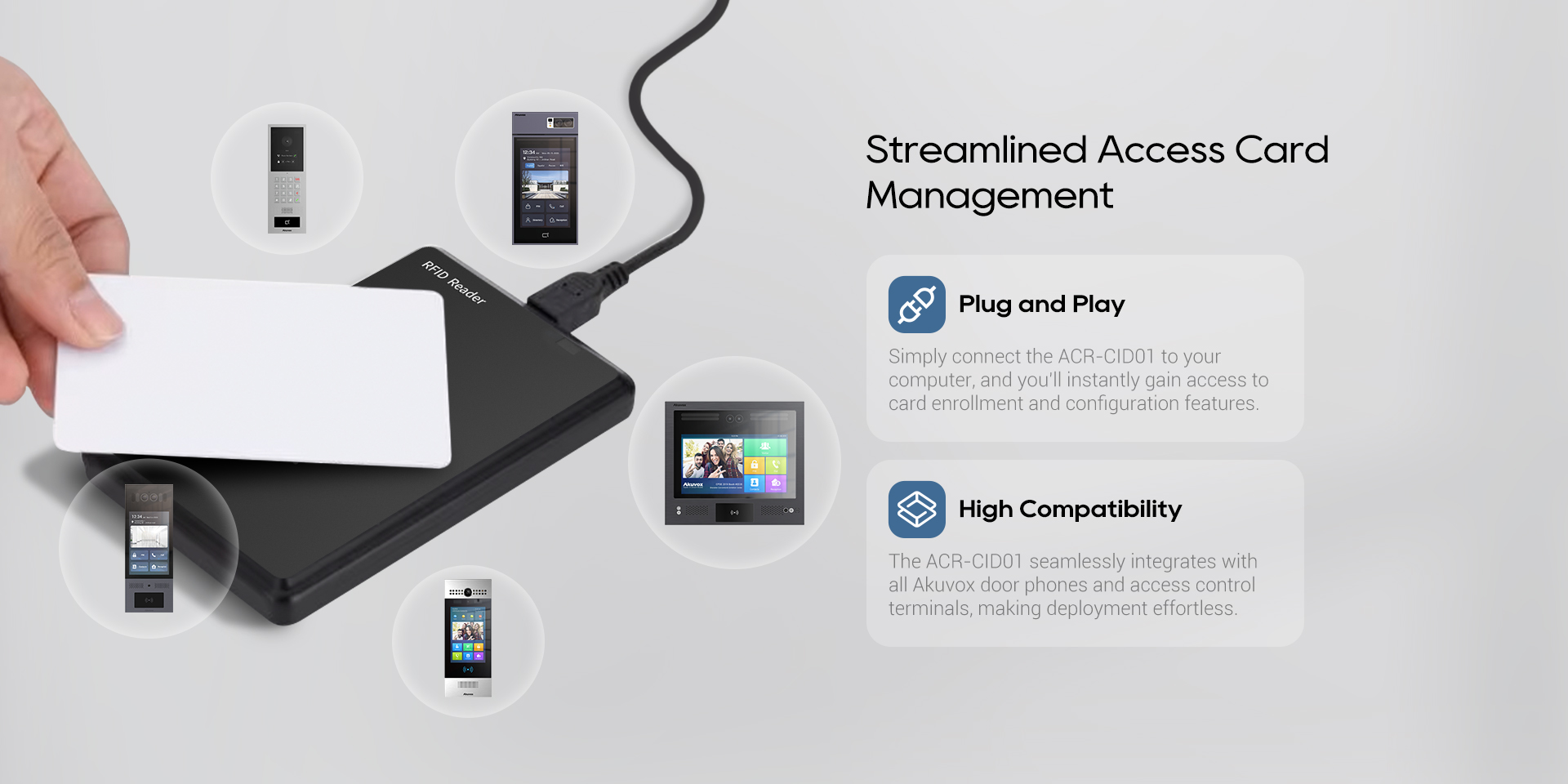 Akuvox's ACR-CID01 is an efficient and multifunctional desktop card reader, designed specifically for modern access control systems. It supports connection to a computer via a USB interface to quickly read information on Bkey/RFID access cards.