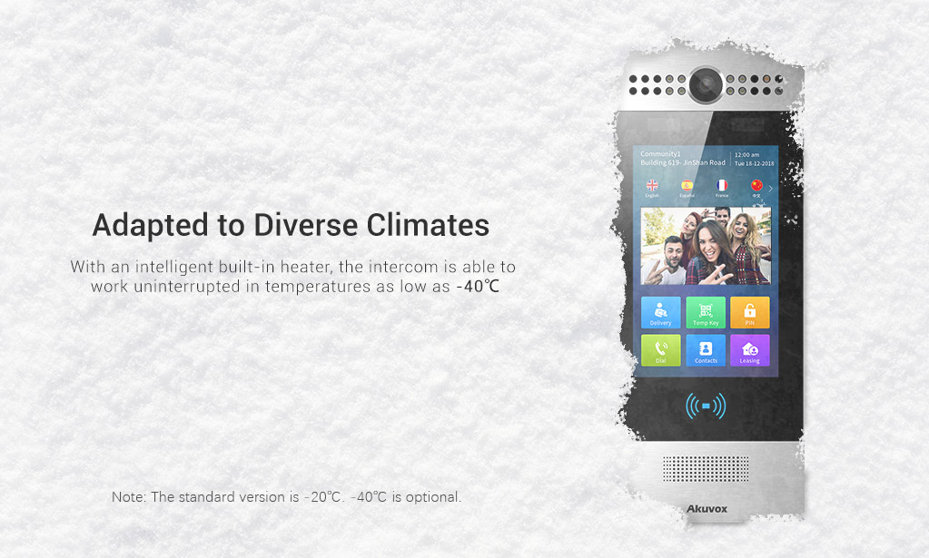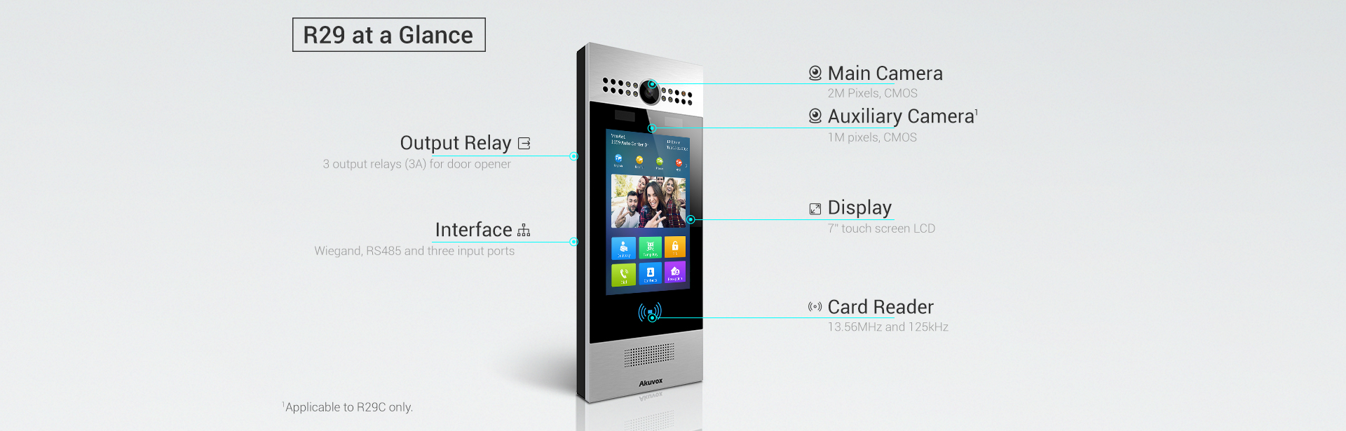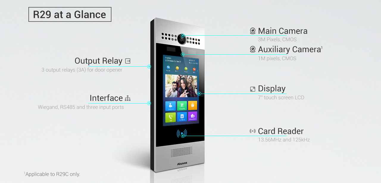 Akuvox R29 is a SIP video doorphone with a 7” touch screen, which performs AI-powered offline facial recognition for door access. It is typically used in apartment buildings, high-rise office buildings and building complexes.