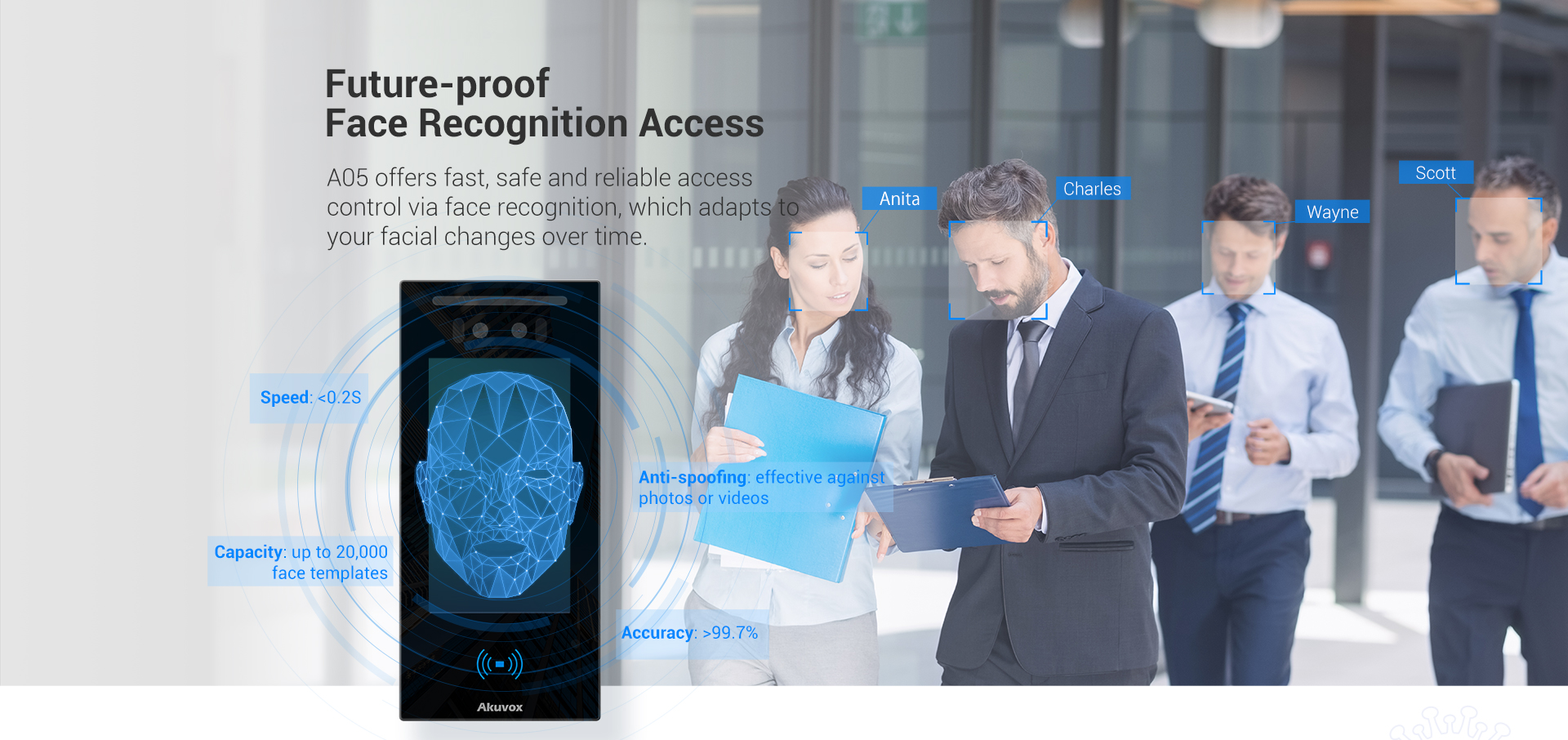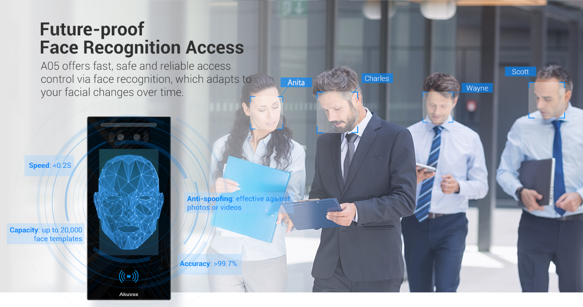 A05 is a commercial-grade access control terminal, which offers fast, safe and convenient access control via AI-powered face recognition, mobile app, NFC, or QR codes. It is typically used in commercial and residential applications.