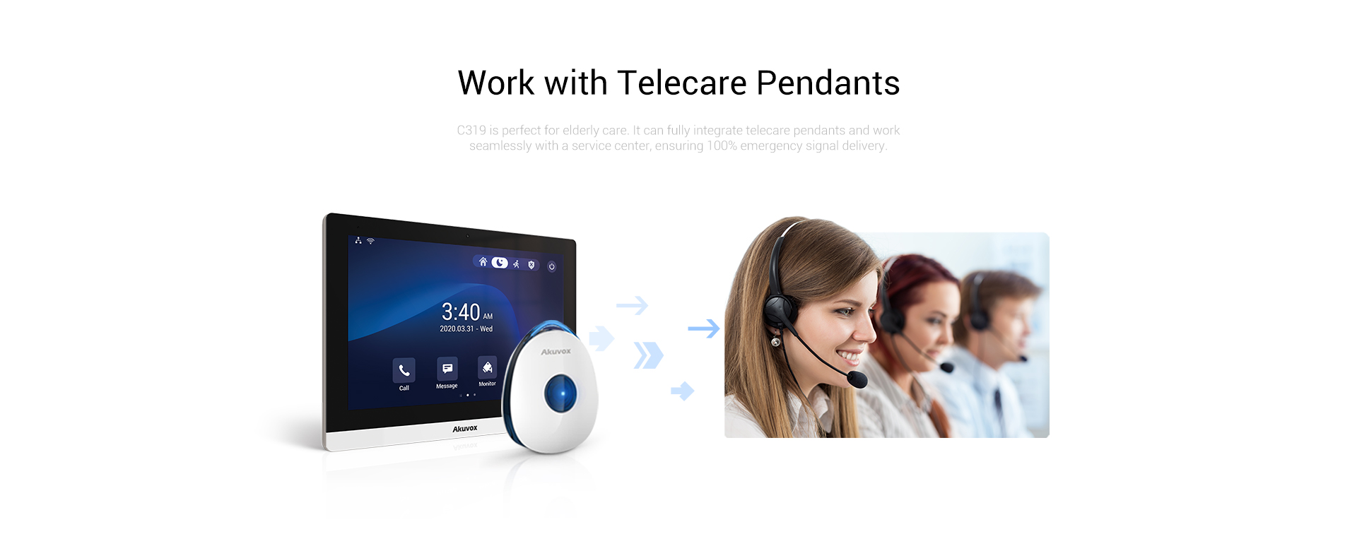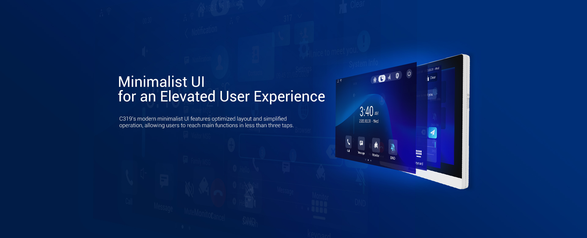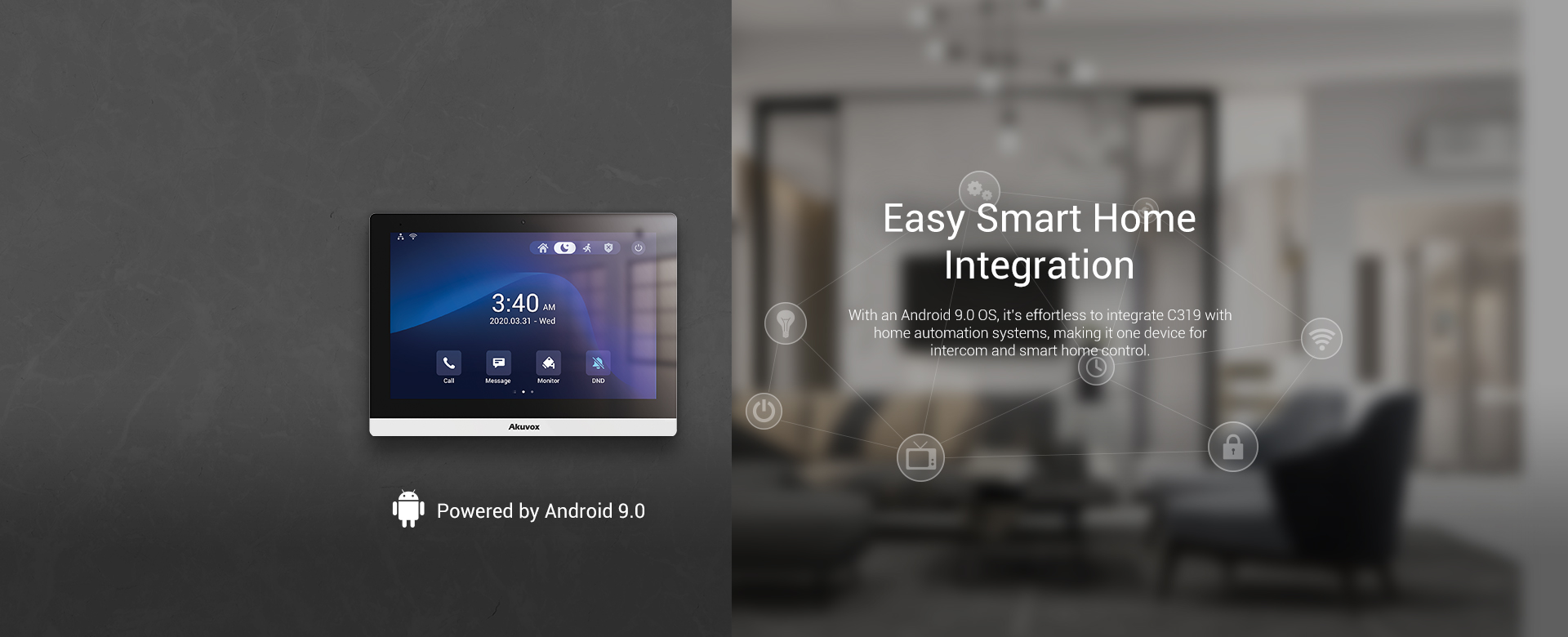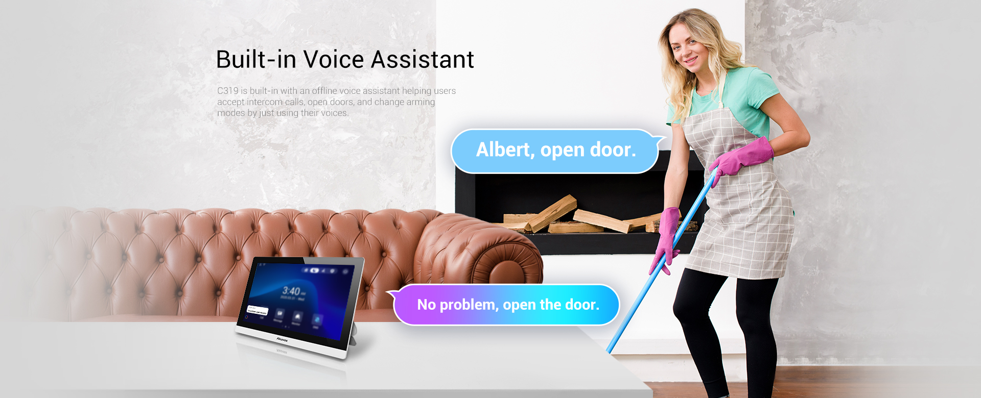 Akuvox C319 is a 10” Android indoor monitor with smart intercom features for people of all ages, an intuitive UI that even kids learn to use quickly, the capability of integrating telecare pendants for older individuals, and a built-in voice assistant for young people.