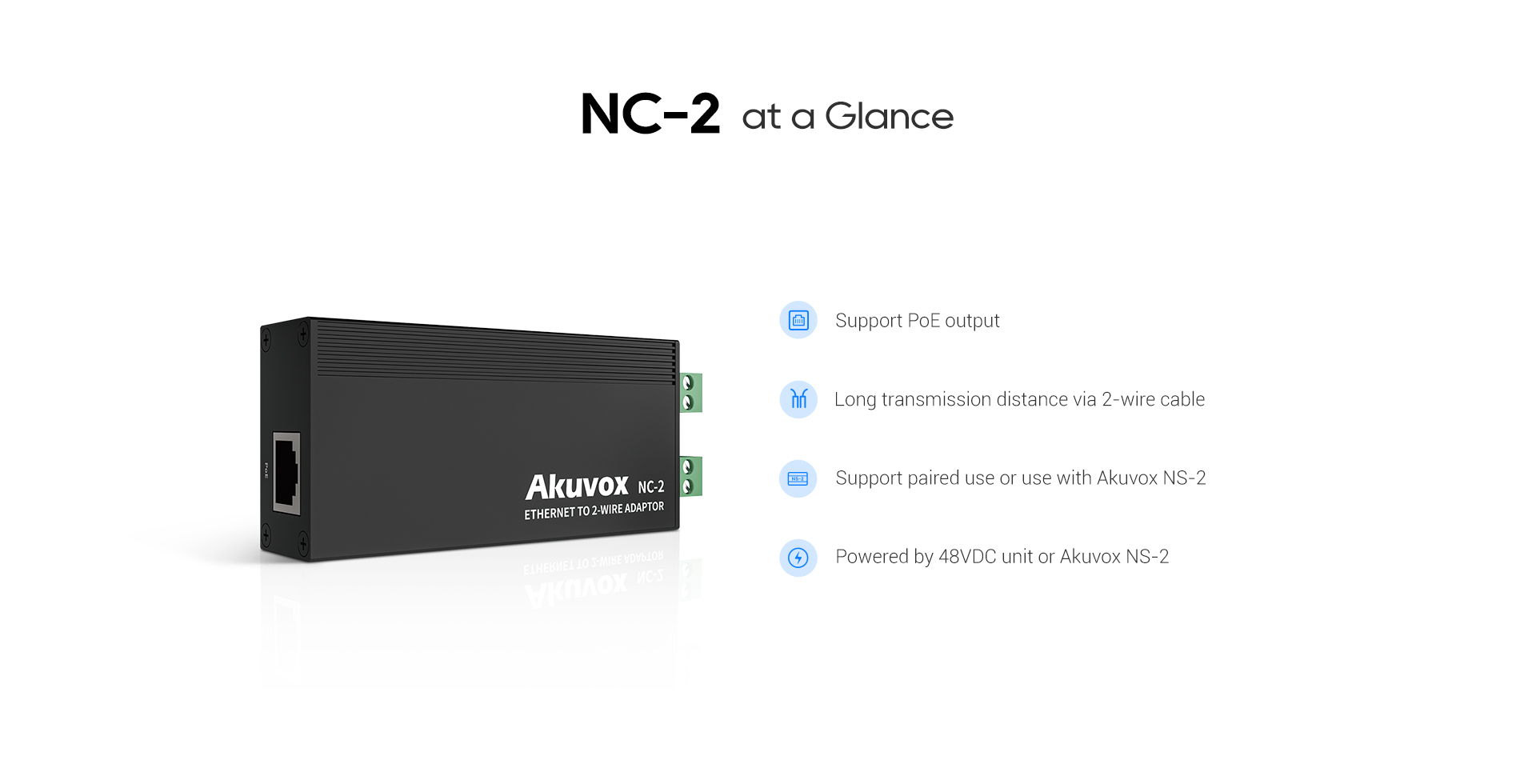 The NC-2 is Akuvox’s 2-wire IP network switch which provides a convenient way to upgrade analogue intercom systems, no need for rewiring. It can be used with Akuvox NS-2 to connect Akuvox door phones to the 2-wire IP intercom network.