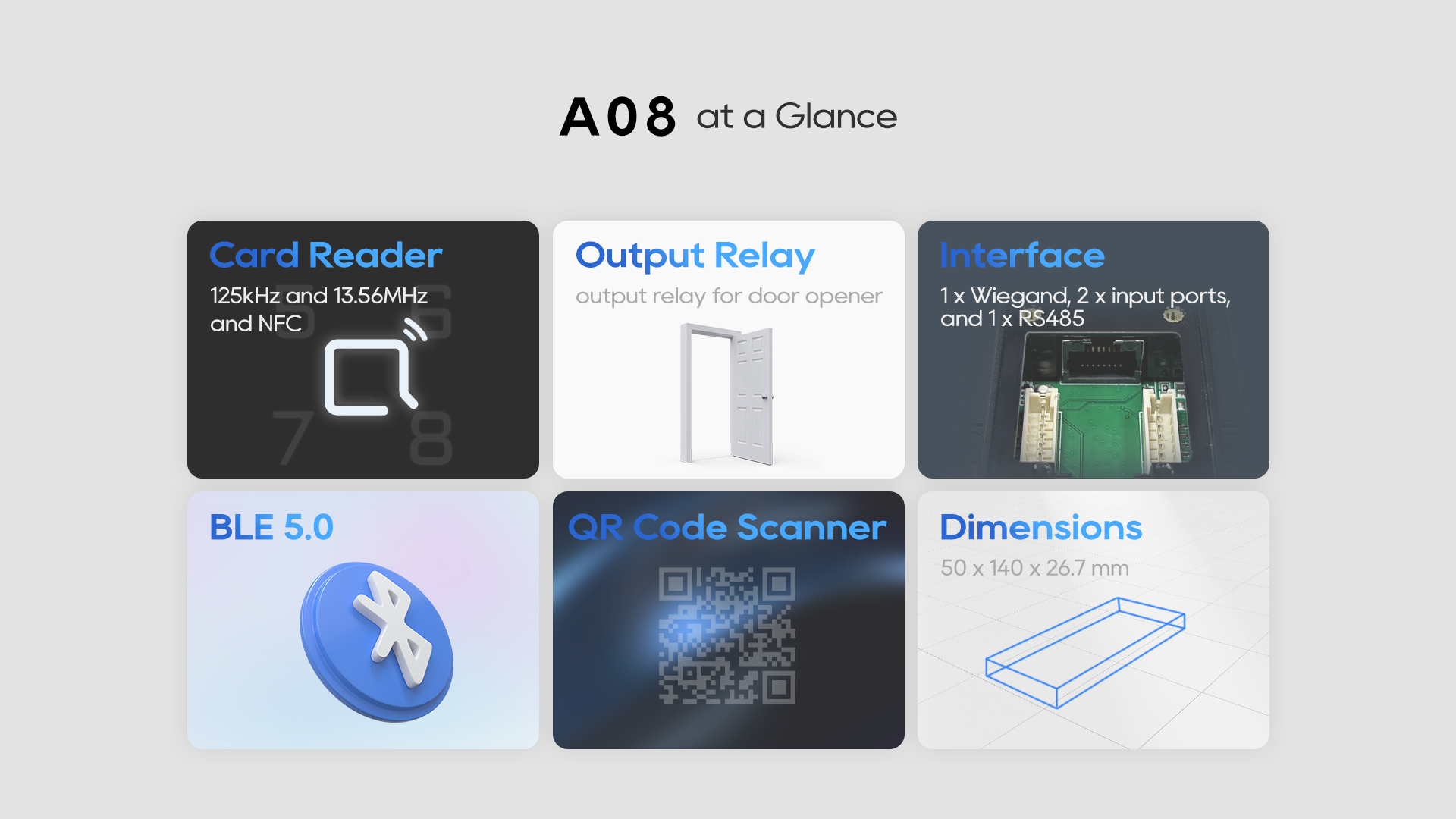 A08, iF Design Award 2025 Winner, is a cutting-edge access control terminal featuring a compact profile and advanced unlocking capabilities, ensuring robust security without compromising efficiency.